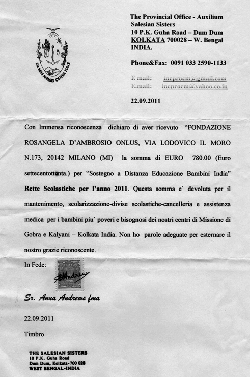 €. 500,00 Utilizzati per il progetto Borsa di studio Madre Teresa Calcutta 2025